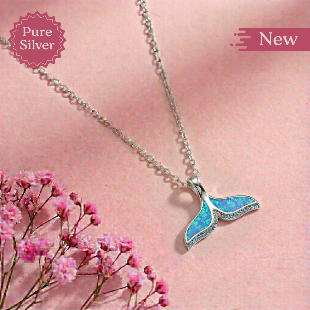 The Blue Opal Whale Tail pendant necklace features a graceful whale tail accented with luminous blue opal. A charming and ocean-inspired piece symbolizing strength and freedom.